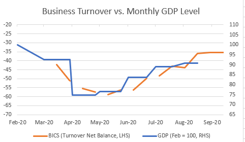 The true figure is probably also now lower – probably closer to 2 million. In part this is because some of these people may also already have lost their jobs. However, other business surveys (including the PMIs and the BICS) suggest that the economy has continued to recover, despite the disappointing GDP data for August.
