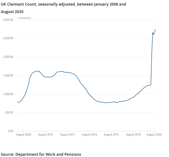 The ‘claimant count’ has soared, but this partly reflects a relaxation of the rules which means that a large number of people who are actually still in work are now eligible for unemployment-related benefits. This figure is therefore (almost certainly) an overestimate of those without jobs.