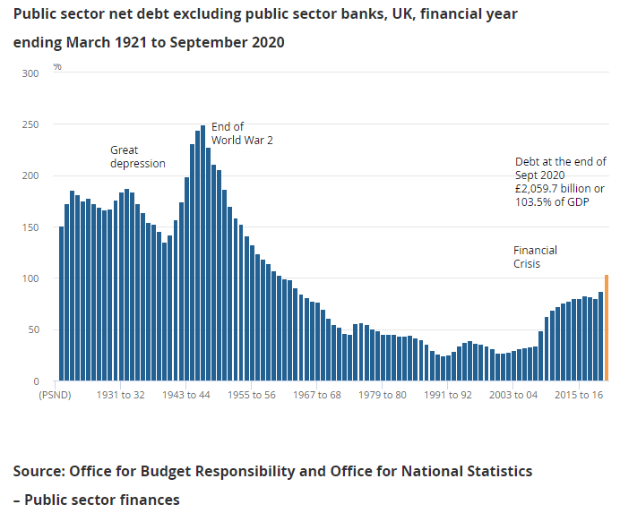 Another month, another set of scary numbers on the public finances: the UK government borrowed an additional £36 billion in September and total public debt rose to £2,060 billion, or around 103.5% of national income (GDP). But there is still no need to panic.