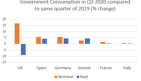 The differences are huge. In the third quarter, UK government final consumption expenditure was estimated to be 17% higher in cash terms than the same period a year earlier, but the volume of goods and services that this money had bought was estimated to have fallen by about 9%.