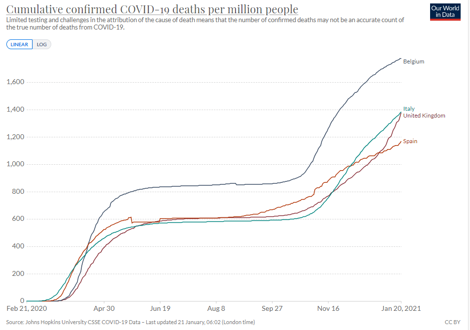 This is presumably due to a combination of the more severe impact of the pandemic itself on the nation’s health, and how people, businesses and the authorities have responded. There is certainly no getting away from the fact that the UK has suffered a relatively large number of Covid deaths.