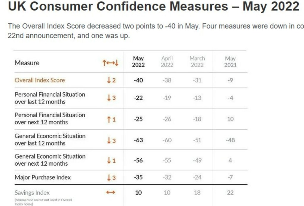 What’s more, the forward-looking components of the surveys are generally holding up better than the backward-looking ones. Sentiment towards personal finances over the next 12 months actually improved in May, albeit by just one point (see table below). This is not ‘free fall’.
