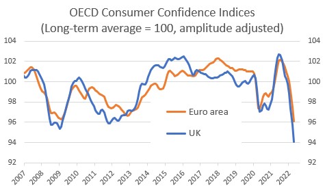 Of course, there is no room for complacency. The trend in UK retail sales is still downwards and confidence is clearly fragile. Unlike in other countries, consumers here have been hit by the double-whammy of soaring inflation and higher taxes. That also helps to explain why the UK has seen a bigger fall in confidence using the OECD indices, which adjust for some of the national biases (see chart below). The poorest households are also the least likely to have savings or other assets to fall back on.