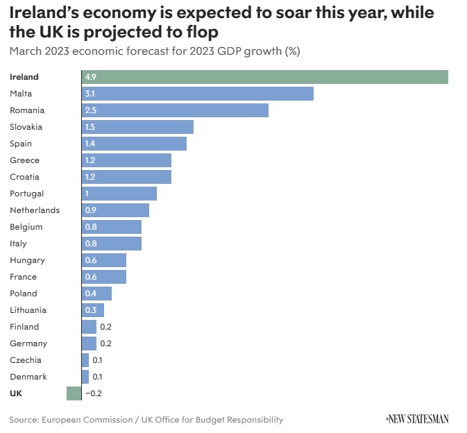 The New Stateman also published this chart, which again has been widely shared. You are meant to draw the conclusion that i) the UK will do badly in 2023 because of Brexit, and ii) this explains the strong performance of Ireland.
