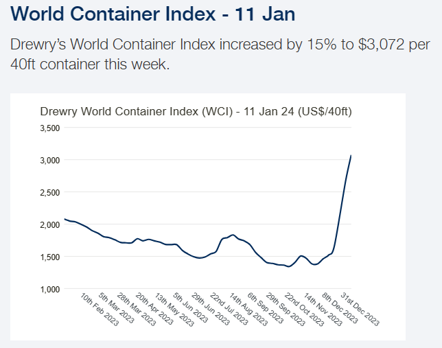 What’s more, this is a global average. Rates on the China to Europe routes that are most impacted by the Red Sea disruption and the approaching Lunar New Year – and which matter most for the UK and EU – have risen by significantly more.