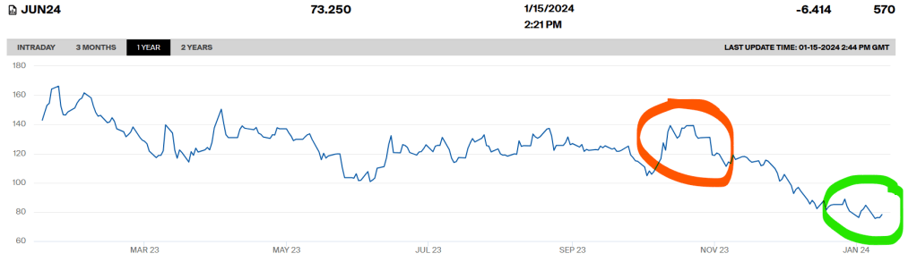 The price of natural gas has also remained subdued. The Bank of England’s November Monetary Policy Report assumed that UK gas prices would average 142 pence per therm in 2024, up from 118p in 2023. This assumption was based (not unreasonably) on what the futures markets were saying at the time. But the markets are now signalling a much lower average price of less than 80p in 2024. (The chart below is the June 2024 contract, but these falls are replicated across the year.)