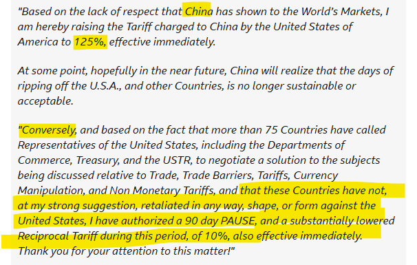 President Trump has just raised tariffs on China to 125%. However, he has also announced a 90-day pause on the ‘reciprocal tariffs’ for those countries that have not yet retaliated.