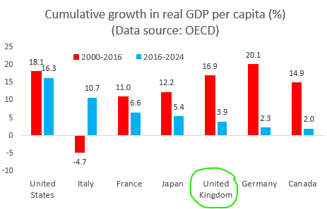The precise numbers vary according to the source. But using some internationally comparable data from the OECD, UK GDP per head grew by a total of just 4pc in the eight years between 2016 and 2024, compared to 17pc in the sixteen years between 2000 and 2016.