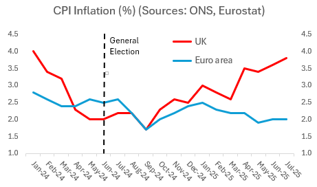 Indeed, after falling to the 2% target in the final two months of the last government, UK CPI inflation has now diverged sharply again from the euro area. This divergence mainly reflects increases in government-set prices (including domestic energy bills and the national minimum wage), the pass through of higher taxes (notably employers’ NI), and higher housing costs.