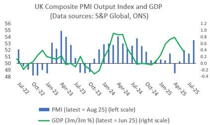 For example, the final UK composite PMI for August (covering services and manufacturing) has just been revised up to 53.5, which is a new one-year high. This provides a little more evidence that the private sector has weathered April’s shocks better than many had feared, even though hiring remains subdued.
