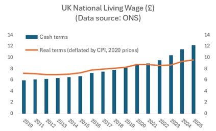 Viewed positively, the NLW has helped to lift many people out of low pay (defined as earning less than two-thirds of the median hourly rate). The latest ONS data show that the proportion of employees who are ‘low paid’ has fallen from 21.3% in 2010 to a series record low of just 2.5% in 2025 (mostly under the Tories).