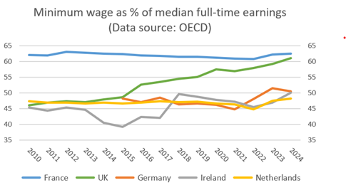 First, the level of the NLW is now much higher. OECD data show that the UK minimum wage is already one of the most generous (relative to average pay) among the major economies. and rapidly catching up with France. This should ring alarm bells given that the French unemployment rate is 7.5% – and as high as 18.1% for young people.