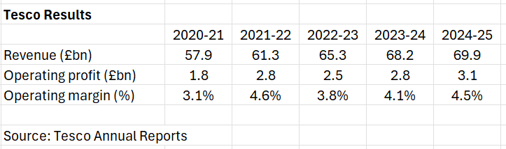 One often-quoted figure is that Tesco’s profits have risen by 75% between the financial years 2020-21 and 2024-25, much faster than the growth in sales of about 21%. But profits in 2020-21 were, of course, depressed by Covid, so this is not a good comparison. Comparing 2024-25 with 2021-22, profits have only risen by 11%, and margins are slightly lower.