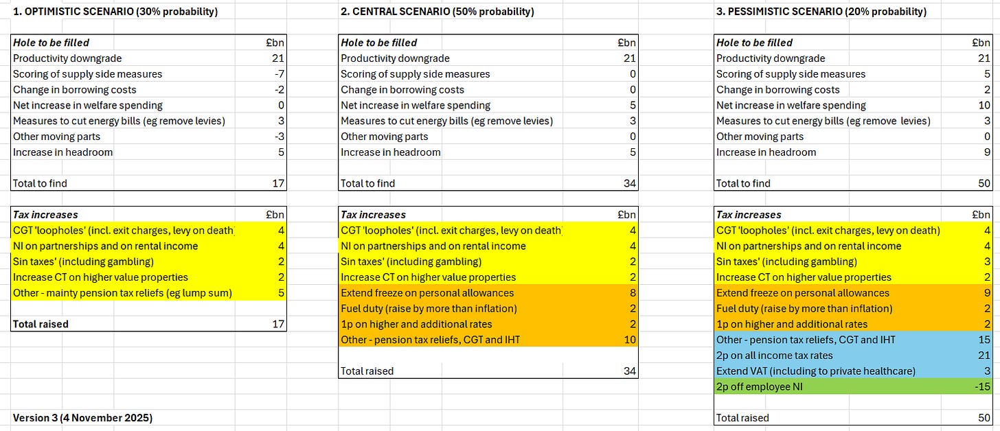 The spreadsheet below reflects this uncertainty by showing three scenarios for the size of the hole (£17bn, £34bn and £50bn) and a set of tax options for each. Obviously, these are just indicative, and there are many other options and permutations.