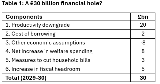 Table 1 is an educated guess at the size of the hole to be filled – £30 billion – and the key components. This is a summary of how changes in the economy and fiscal backdrop since the OBR’s previous forecast in March, as well as the impact of new policy measures – might affect borrowing and debt in 2029-30. All these numbers are only indicative and there are many different ways of arriving at the same total, or a much higher or lower figure.