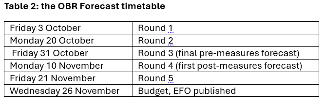 The second element in Table 1 is the change in the government’s cost of borrowing since March. The OBR’s assumptions here are based on average market expectations for Bank Rate (the official interest rate set by the Bank of England) and gilt yields during an ‘observation window’ ahead of the final pre-measures forecast. Table 2 sets out the timetable for this Budget.