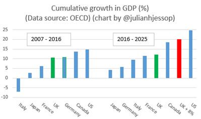At first sniff, then, the 8% figure fails a simple ‘smell test’. For context, the UK economy has grown by about 12% since 2016, outpacing Japan, Germany, Italy and France. If you add another 8% the UK would have been the fastest growing economy in the G7 – bar only the US – and left its EU peers far behind. This would not be impossible, but it is surely unlikely.