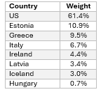 This control group can be a very odd bunch. Indeed, here are the weights in the NBER doppelgänger (note the paper wisely uses a measure of modified domestic demand for Ireland, rather than GDP, though these data are still not strictly comparable).
