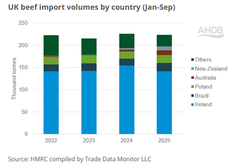 Crucially, the large percentage increase in imports from Australia was from a low base, meaning they still represented only 4.3% of total UK imports from January to September. Total UK beef imports actually fell slightly over this period, due mainly to lower shipments from Ireland.