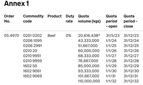 First, the UK-Australia trade deal has significantly increased the amount of beef that can be imported tariff free, and this quota will continue to ratchet up over time. In 2025, for example, the tariff-free quota was set at 51,667,000 kg, or 51,667 tonnes, and this will more than double by 2032.