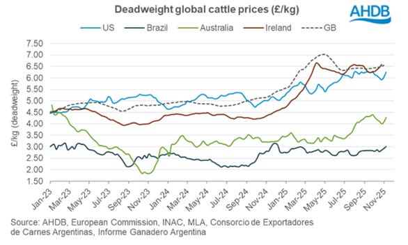 Finally, note that UK beef prices have risen sharply and remain high. Of course, costs have risen sharply too, but this is also hard to square with the narrative that UK farmers are being undercut by a “flood of cheap imports”.