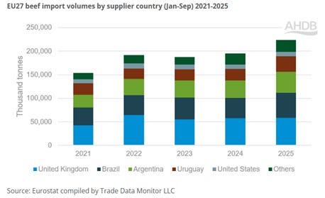 Indeed, data published by the Agriculture and Horticulture Development Board (AHDB) back in November showed that beef imports from Australia jumped to 9,700 tonnes in the first three quarters of 2025, from 3,800 tonnes in the same period of 2024. This was a rise of 155%. But that was still just a trickle compared to total UK imports, as this chart shows.