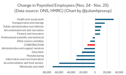 The construction sector has also continued to shed jobs, suffering (like most others) from the increases in labour costs imposed by Rachel Reeves’ Budgets.