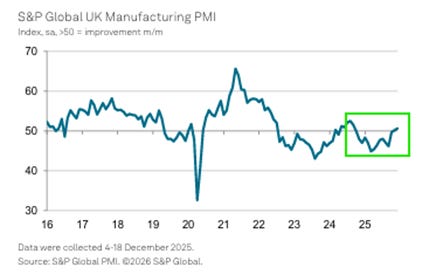 Finally, the UK economy probably grew by 1.4% in 2025 as a whole. This would be just a rounding error below the 1.5% assumed by the OBR for the November Budget. It compares favourably as well to the first official estimate of Germany’s economic growth last year (also released today), which was just 0.2%.