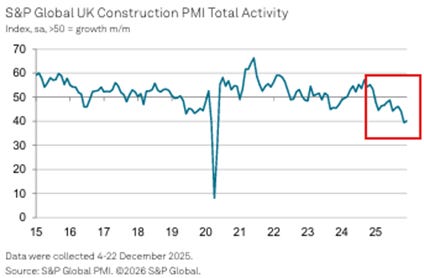 Second, November saw another large monthly fall in construction activity, adding to evidence that the government’s mission to “build, baby, build” is failing to launch. (See my earlier post on this here.)