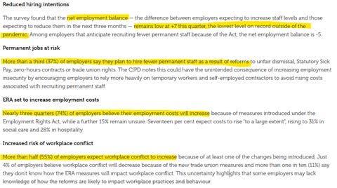 This was illustrated this week by the CIPD’s latest Labour Market Outlook, which provided a damning verdict on the (presumably unintended but entirely predictable) consequences of the ERA. I have pasted the key points below.