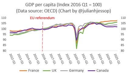 For example, perhaps the UK’s apparently poor performance on GDP per capita has had far more to do with the UK’s relatively high energy costs and the EV transition. This also explains why Germany has underperformed, especially against France. Relatively high levels of net immigration may have played a part too, as they have in Canada.