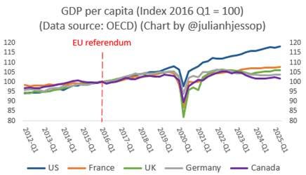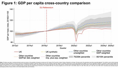 In particular, this is how the authors of a working paper published by the NBER last November arrived at their estimate that UK GDP per capita was 8% lower by 2025 than it would have been without Brexit. That figure has since been widely quoted, including by Chancellor Rachel Reeves in her Mais Lecture in March.