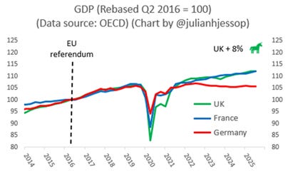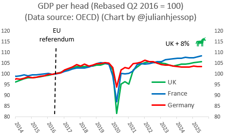This next chart makes the point in a different way, focusing on just France and Germany. The “green unicorn” shows where the UK would have been if continued EU membership had magically added another 8% to GDP.