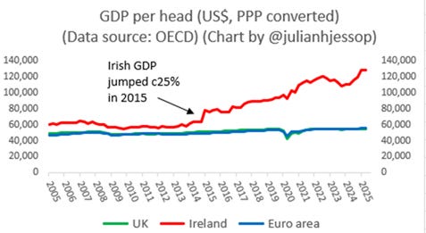 No-one with a basic grasp of economics would suggest that the UK has fallen this far behind Ireland because of Brexit. But this did not stop the New Statesmen from running a piece in 2023 titled “Ireland booms while Brexit Britain whimpers next door”, which was widely shared by all the usual suspects.